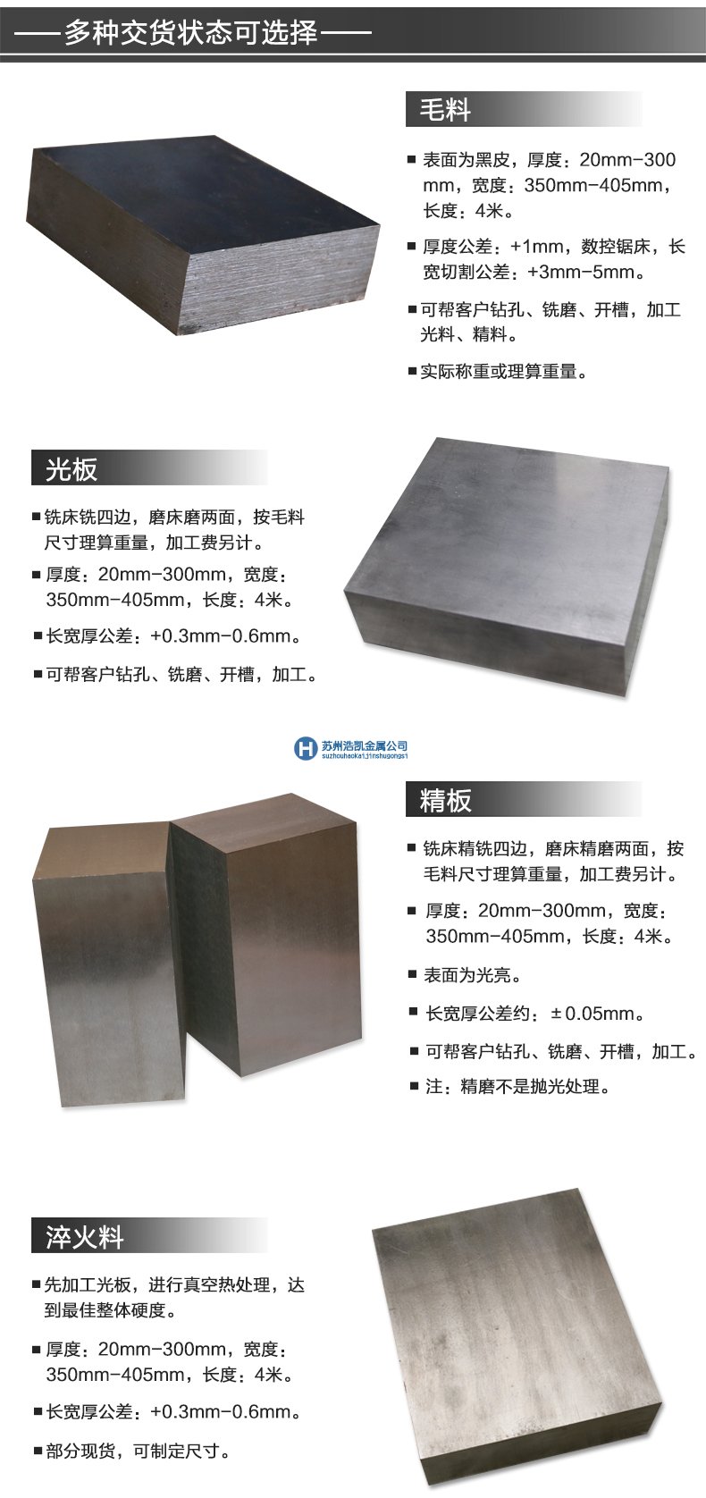 蘇州浩凱DC53模具鋼物流配送運(yùn)輸?shù)貐^(qū):北京,上海,重慶,天津,江蘇南京_徐州_蘇州_無錫_昆山_揚(yáng)州,太倉_吳江_連云港_泰州_鹽城_鎮(zhèn)江_南通_常熟_常州_張家港,浙江溫州,杭州,寧波寧海_余姚_臺州黃巖_金華_紹興_嘉興,福建福州_廈門,廣西南寧_柳州,安徽合肥_安慶_蚌埠_巢湖_淮安_蕪湖_淮南_黃山_滁州_宣城,山東濟(jì)南_青島_日照_濱州_煙臺_威海_濟(jì)寧_聊城_臨沂_淄博,湖南長沙,重慶,河北石家莊,河南鄭州_洛陽_開封,湖北武漢,江西南昌,陜西西安,山西太原及云南昆明。歡迎各地模具廠商來電垂詢DC53模具鋼價(jià)格和DC53模具鋼熱處理機(jī)加工事宜。目前我司DC53模具鋼現(xiàn)貨庫存表統(tǒng)計(jì)數(shù)量為12噸。